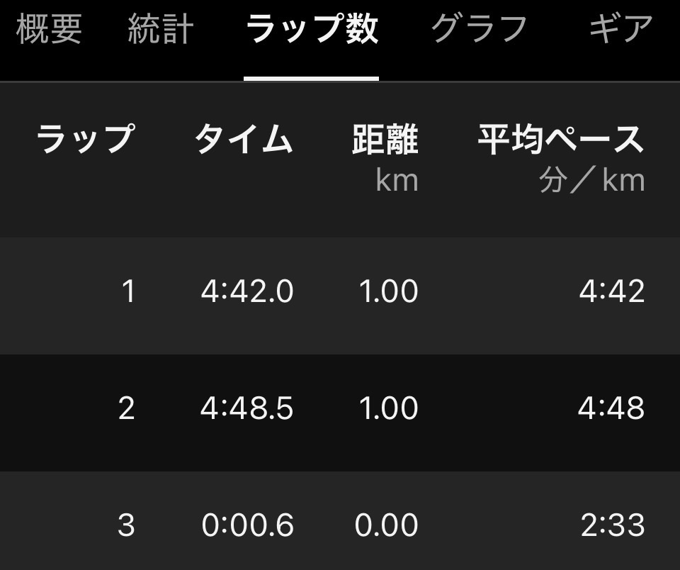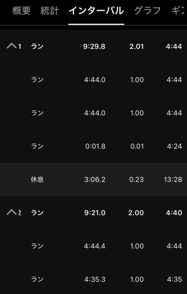 1本目の初速が速くて少し焦る。マラソン大会の本番もそうだけど、脚が動くわー軽っ!って調子に乗ると後で絶対後悔するやつ。ペースを抑えるのってほんと難しい、やっぱり最初の1k速かった😖